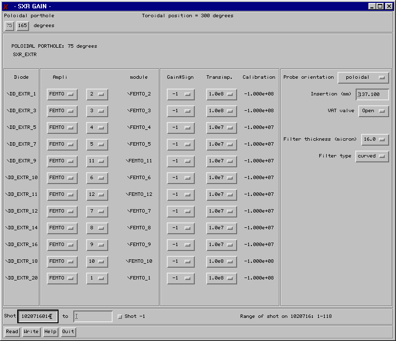 The window shows the configuration for the SXR1 probe: you can recognise it by the 'SXR_EXTR' (the original name of the SXR1 probe); also '75 degrees' indicates that the probe is that installed in the 75 degree (poloidal) porthole. Click the '165' button above and the card of the SXR2 configuration will be displayed (this probe is inserted in the 165 degree (poloidal) porthole. Let's suppose the gain of the diode 5 of SXR1=SXR_EXTR has been changed from 1x10^7 to 1x10^8, and suppose that you do this before shot 1020717010. The operations to be performed are: