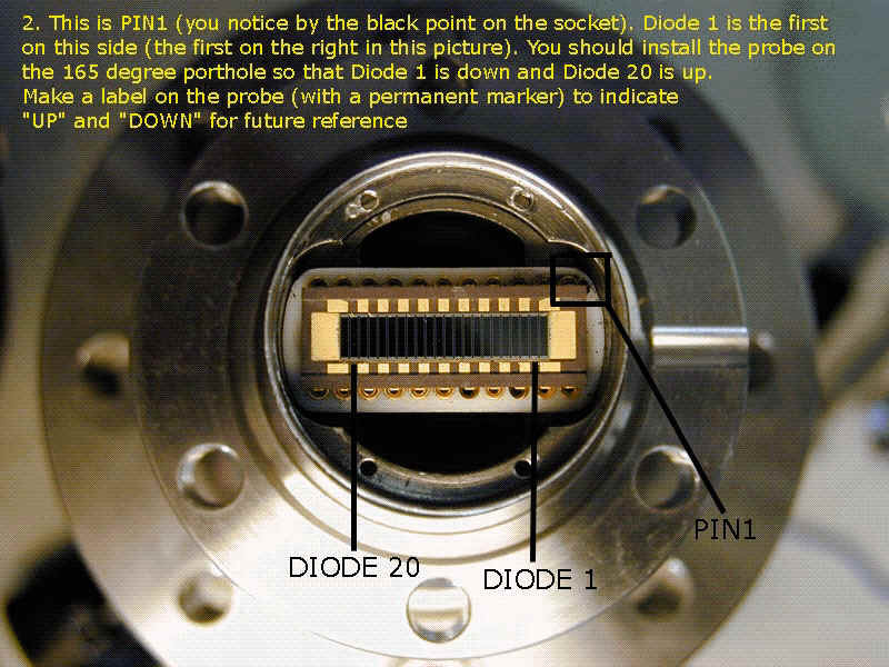 Find the black point on the socket: this is PIN1; you can then find Diode 1 and 20. Make a label (with a black permanent marker) and write "UP" on the probe on the side of Diode 20, and write "DOWN" on the side of Diode 1. This way the line of sight of Diode 1 will point up and that of Diode 20 will point down.