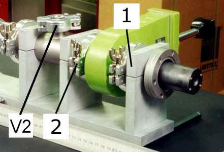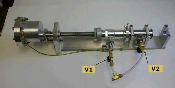 - open the valves of the roughing line. First the V1 valve (Fig.2), and the roughing line should increase and then decrease quickly. When roughing pressure is around 13 mTorr open the second valve, V2 (Fig.2). Pressure will increase to several mTorr and will decrease slowly; it will take up to two hours to get to 10 mTorr;